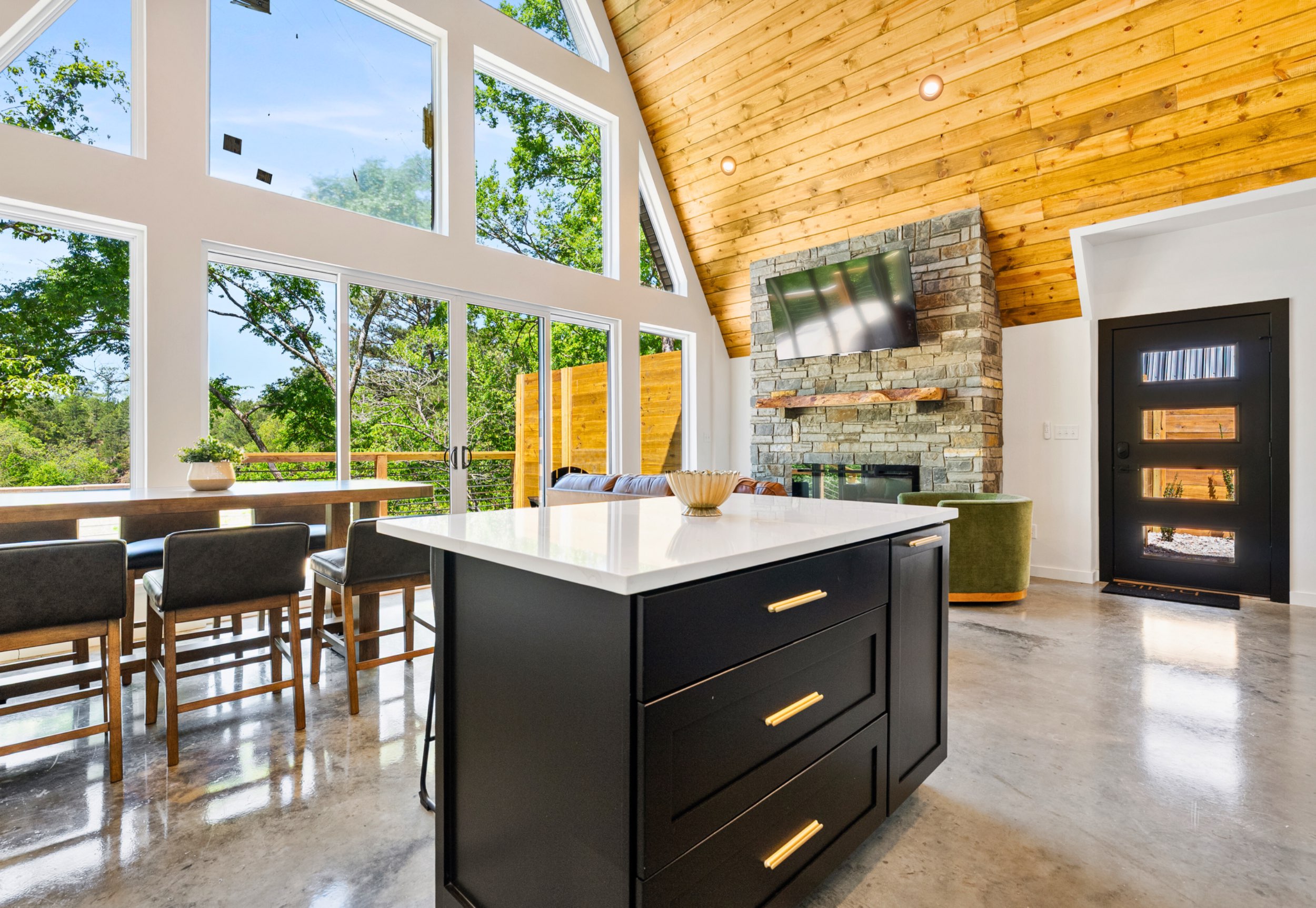 Settle into mountain life at Jockey, a modern A-frame tucked among the trees in scenic Hot Springs, Arkansas. This thoughtfully designed cabin blends rustic charm with clean, contemporary finishes, creating a space that’s both stylish and welcoming. With two king bedrooms and a loft that includes a queen mattress in the upper nook and a queen sleeper sofa below, there’s plenty of room for couples, families, or small groups to relax and recharge. Two full bathrooms, a fully equipped kitchen, and a cozy living area with vaulted ceilings and a fireplace round out the inviting interior.