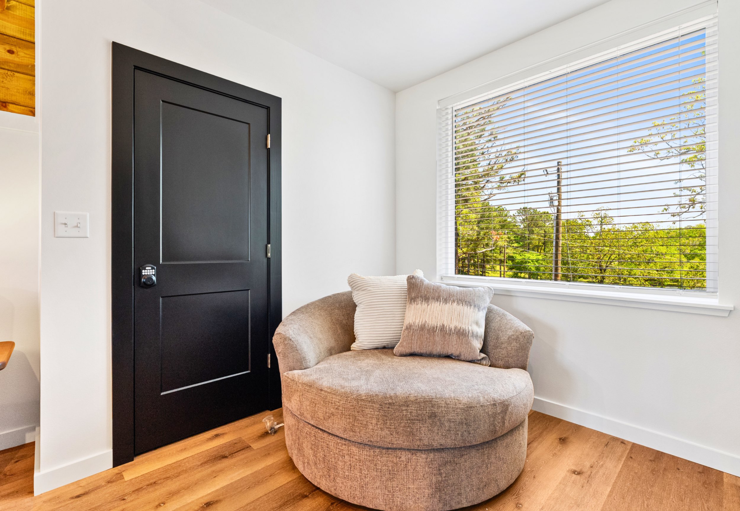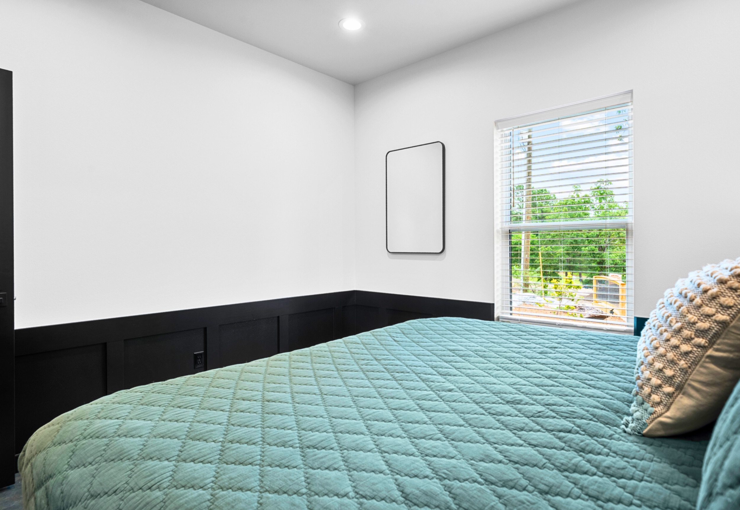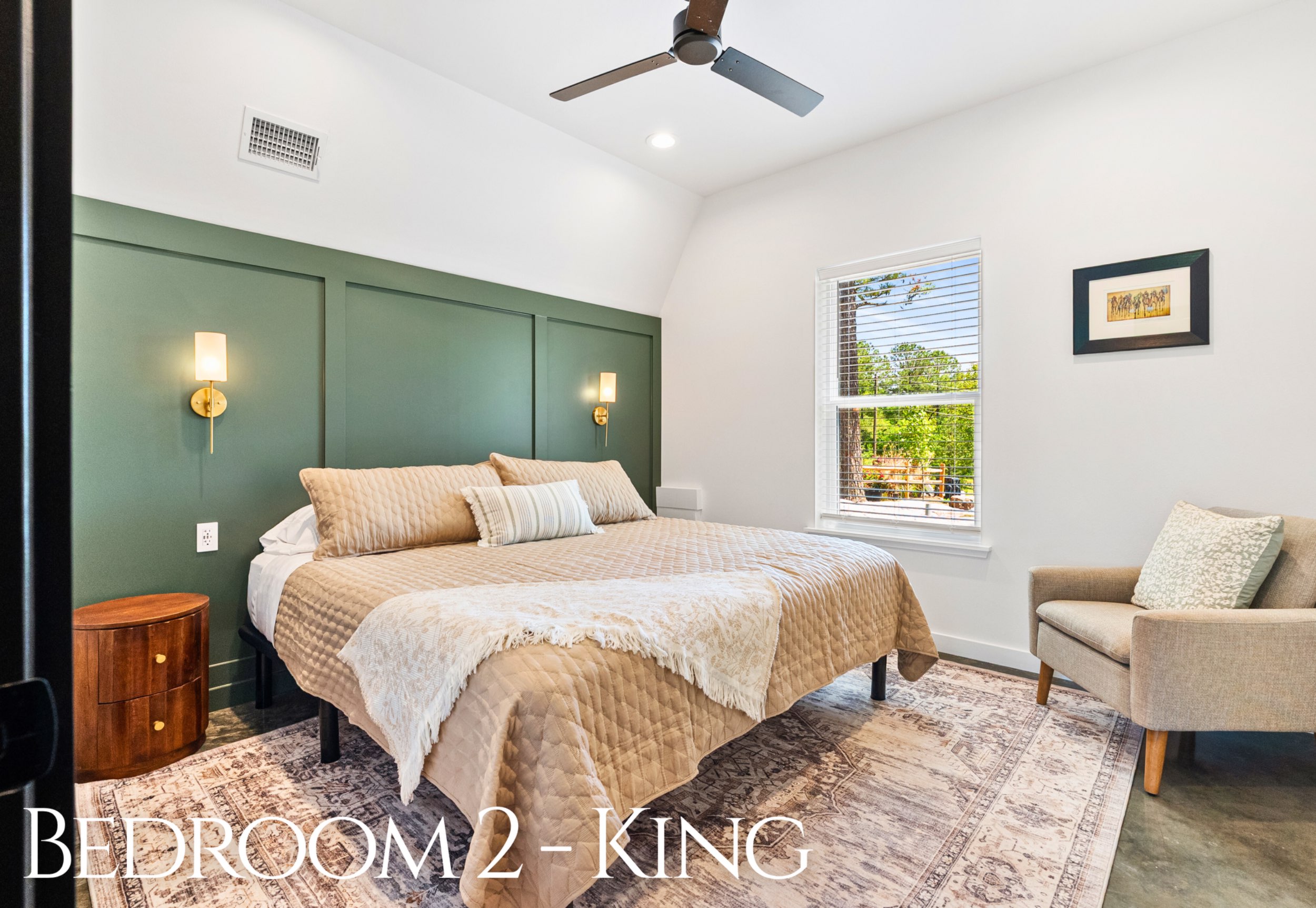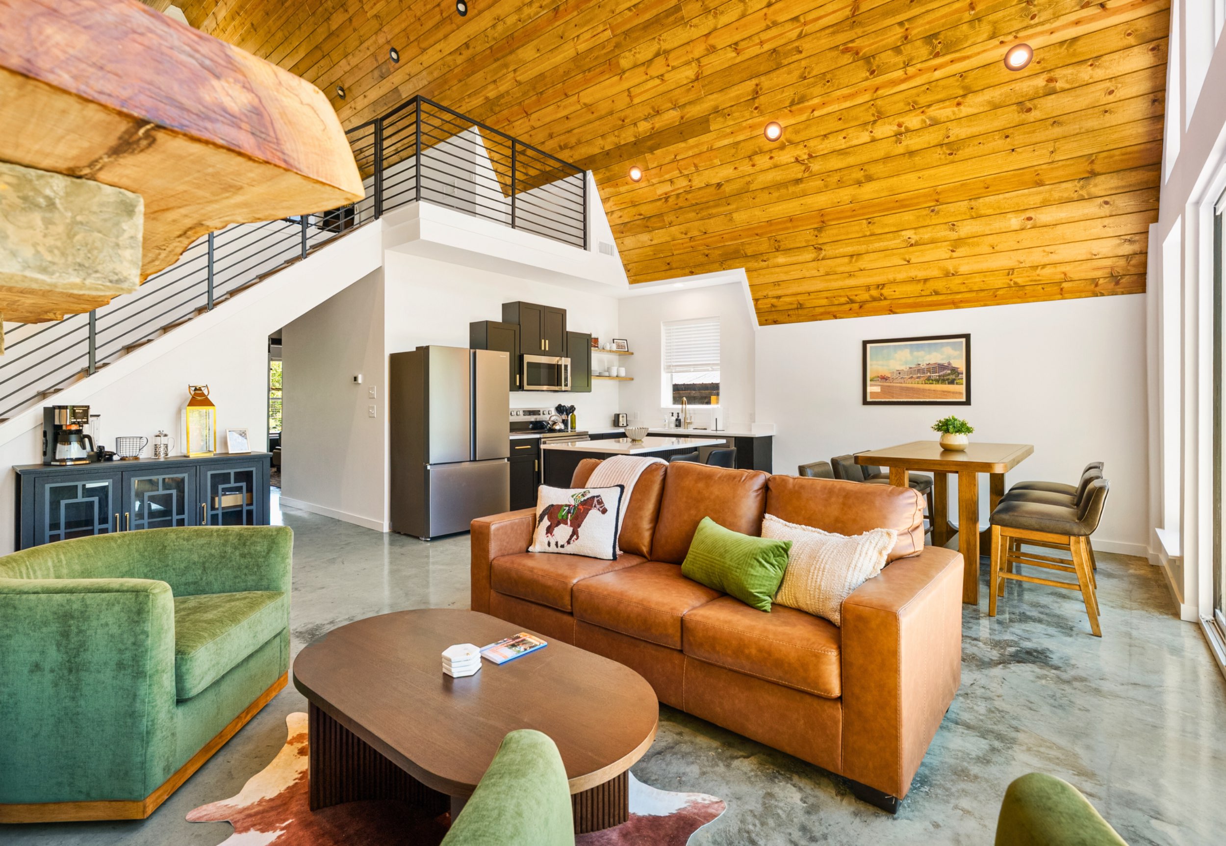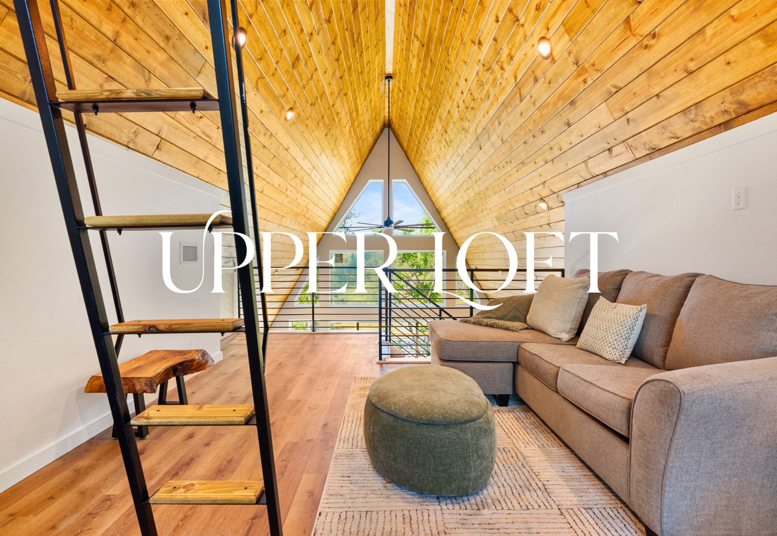 Each bedroom offers a cozy retreat, complete with a plush king bed and a calming, modern design. Upstairs, the loft provides extra sleeping space with a queen mattress tucked into the upper nook and a queen sleeper sofa below, making it a flexible spot for families or groups. Two full bathrooms are thoughtfully finished with stylish tile and contemporary fixtures, giving everyone plenty of space to refresh and relax after a day of exploring.