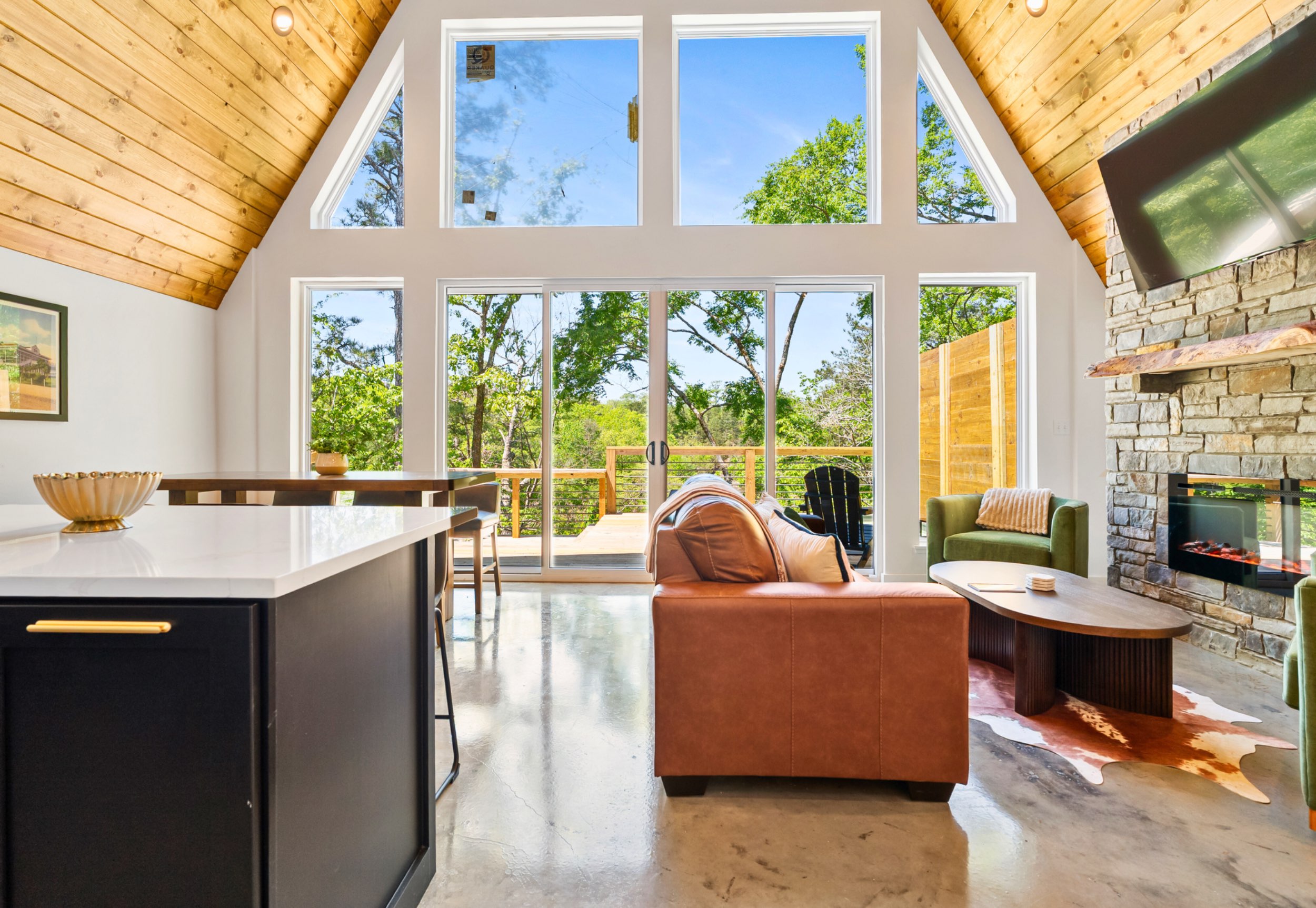 – Open living space with vaulted ceilings and a fireplace