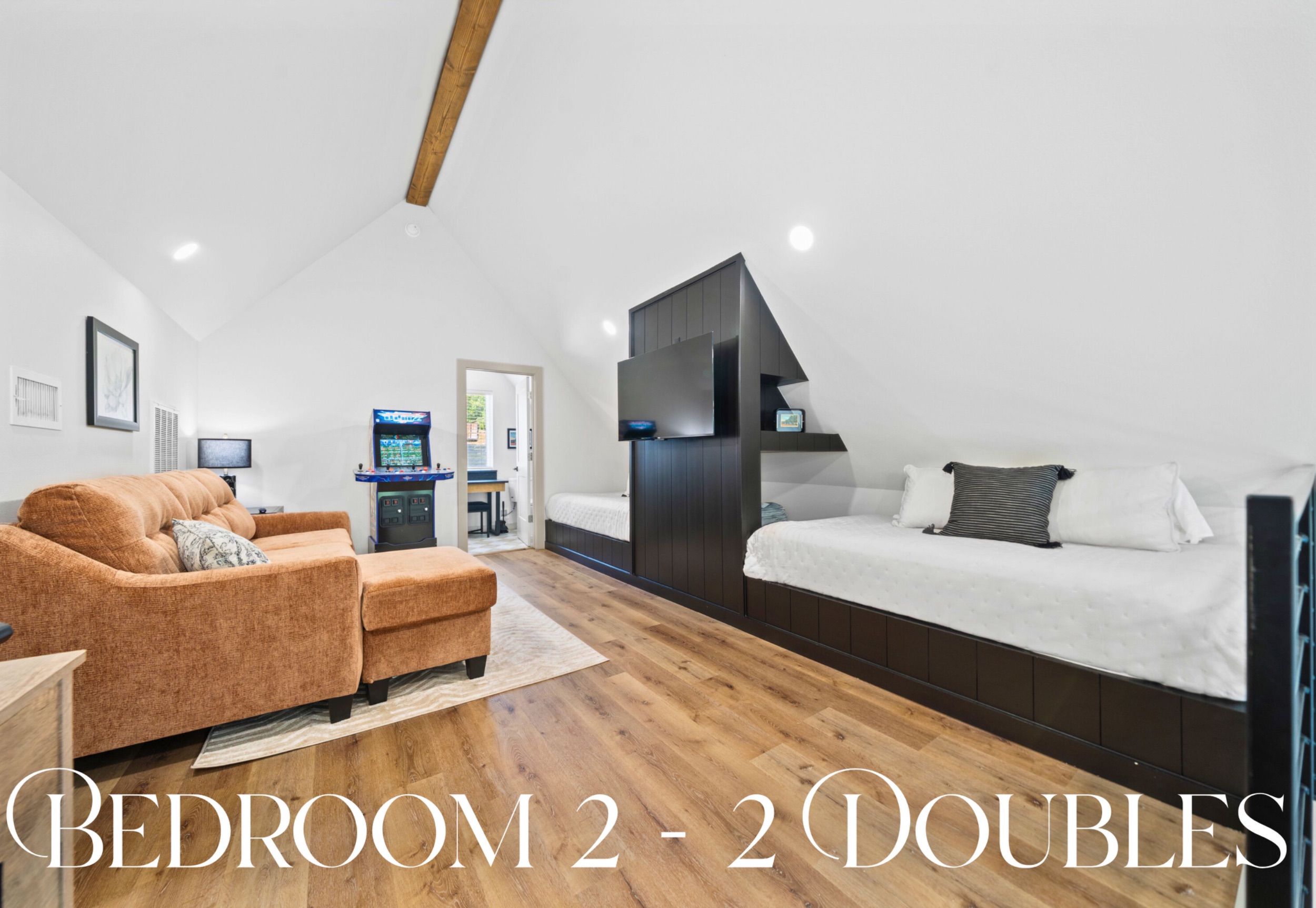 The primary bedroom on the main floor features a king bed and ensuite bathroom, creating a peaceful retreat at the end of the day. Upstairs in the loft, two double beds and a queen sleeper provide flexible sleeping space for families or groups. A second full bathroom upstairs makes sharing easy. Every detail—from the plush bedding to the modern fixtures—is designed with comfort and convenience in mind.